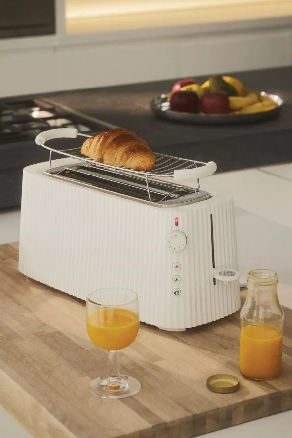 Het Plissé broodrooster lang van Alessi is ontworpen door Michele De Lucchi. Het broodrooster heeft een lengte van 46,5 centimeter, een diepte van 18,5 centimeter en een hoogte van 25 centimeter. Het broodrooster is gemaakt van thermoplastic hars en roestvrij staal. Het broodrooster heeft een rooster, een ontdooi en een opwarm functie. Het broodrooster wordt geleverd met een apart rooster-rek in roestvrij staal. Het broodrooster heeft een anti-slip basis. Het broodrooster is verkrijgbaar in verschillende kleurvariaties.