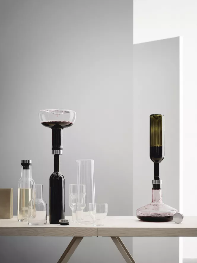 De Wine Breather karaf van Audo Copenhagen is ontworpen door Norm Architects. De karaf heeft een hoogte van 22 centimeter en een diameter van 16,5 centimeter. De karaf heeft een inhoud van 1 liter en is gemaakt van glas, siliconen, staal en plastic. De karaf is in verschillende kleurvariaties verkrijgbaar.