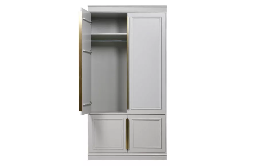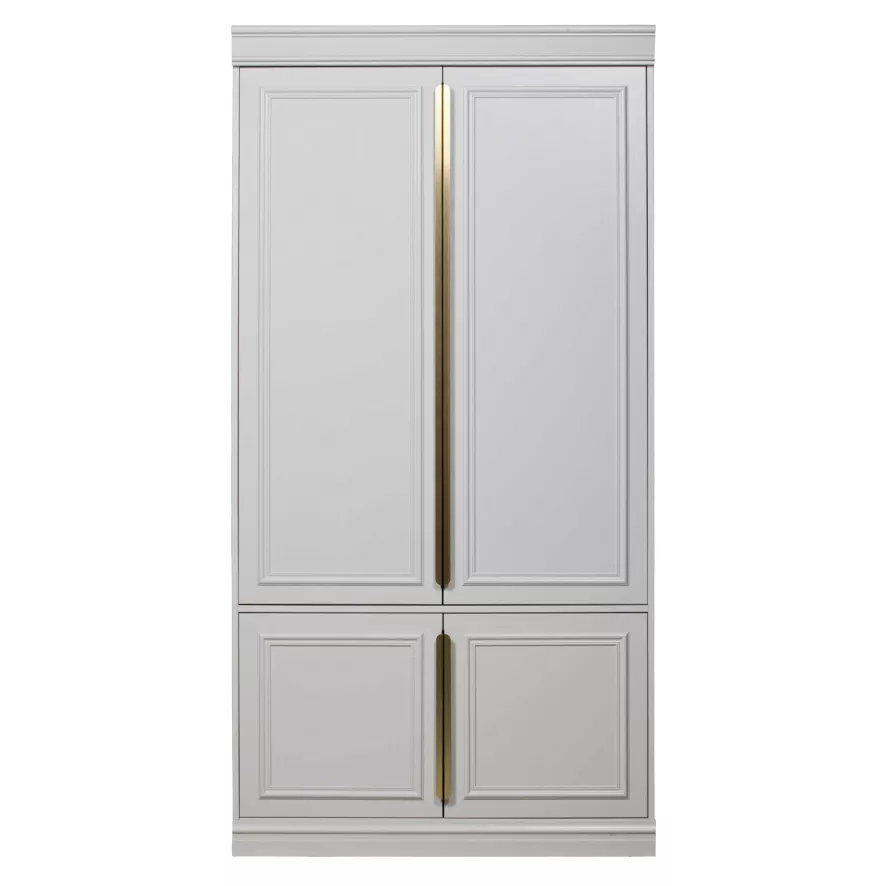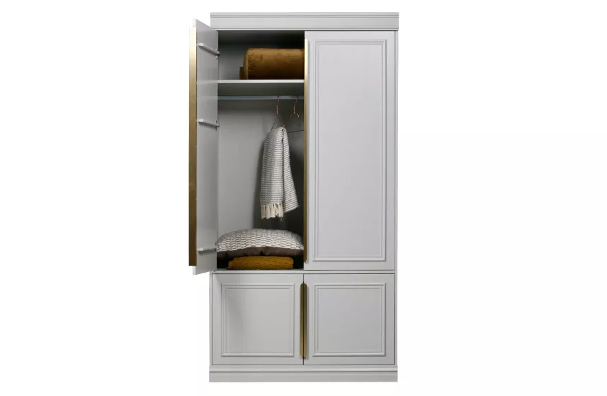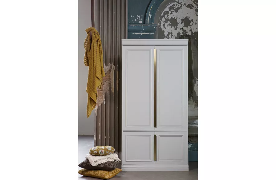 De Organize kast 62 van BePureHome heeft een hoogte van 215 centimeter, een breedte van 110 centimeter en een diepte van 62 centimeter. De kast is gemaakt van massief FSC gecertificeerd grenen, wat betekent dat het hout uit goed beheerde bossen komt. Het hout is gelakt in een grijze kleur met een geschuurde afwerking. De deuren van de kast zijn voorzien van sierlijsten en een goudkleurige metalen handgreep over de gehele lengte van de deur. De kast wordt standaard geleverd met hanggedeelte en 1 legplank over de gehele breedte van de kast. Het is mogelijk om een extra interieurpakket die bestaat uit 3 legplanken over de gehele breedte van de kast erbij te bestellen.