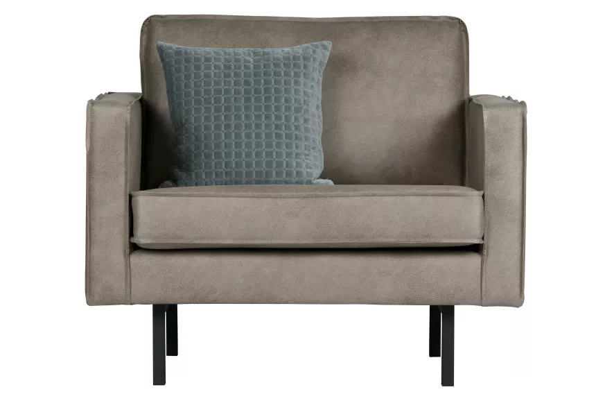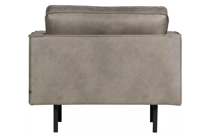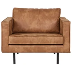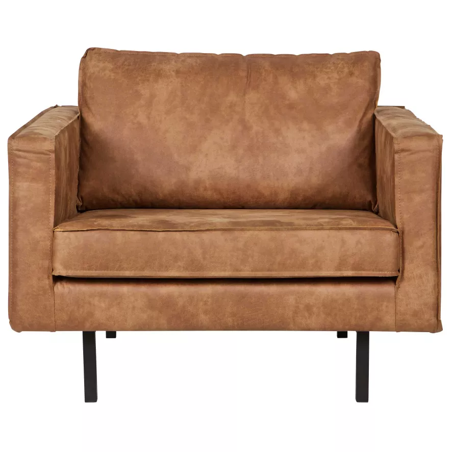 De Rodeo fauteuil van BePureHome is 85 centimeter hoog, 105 centimeter breed en 86 centimeter diep. De fauteuil is gemaakt van eco-leer (een duurzame stof van 70% leer en 30% polyester) met een hoge kwaliteit en is verkrijgbaar in de kleuren cognac en zwart.