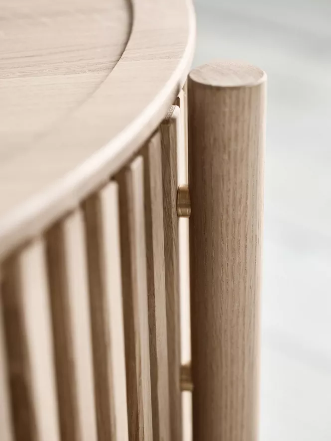 De Story bijzettafel is 64 centimeter hoog en heeft een diameter van 44 centimeter. De tafel is gemaakt van FSC-gecertificeerd wit gepigmenteerd eikenhout. Het natuurlijke eiken verandert in de loop der jaren van karakter, dat maakt elke Story bijzettafel uniek. De bijzettafel is in elkaar gezet met zes bouten die op een creatieve manier in de tafel zijn verwerkt. De poten worden los van het blad geleverd en moeten nog gemonteerd worden.