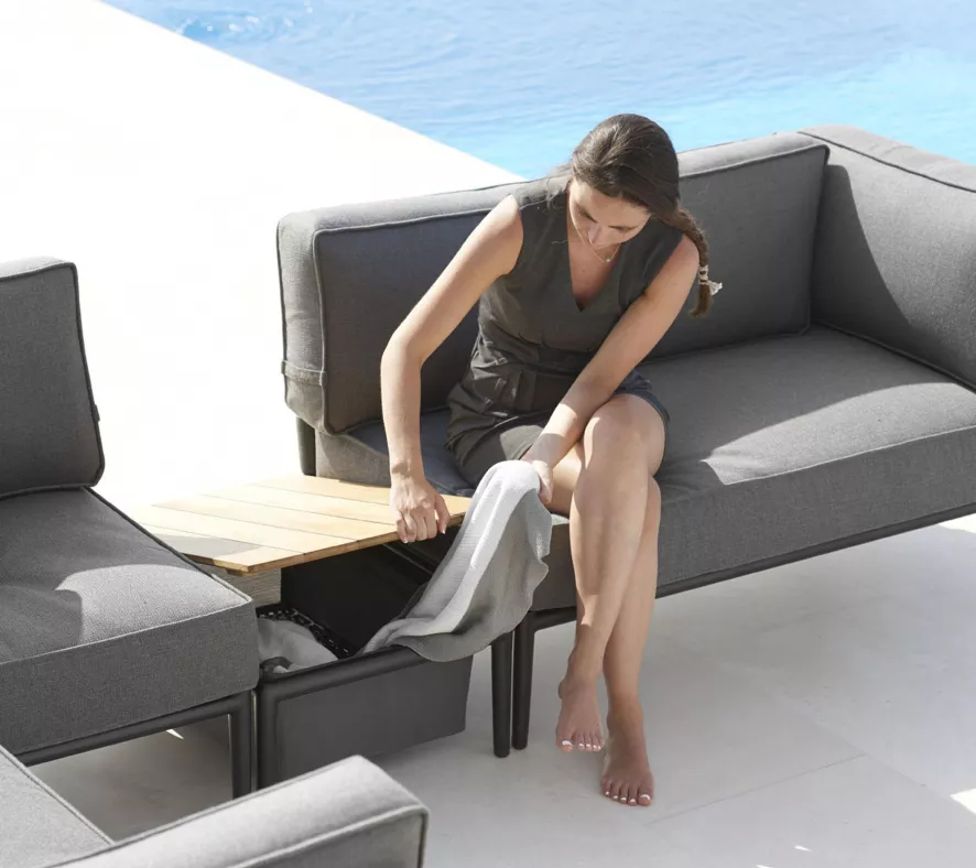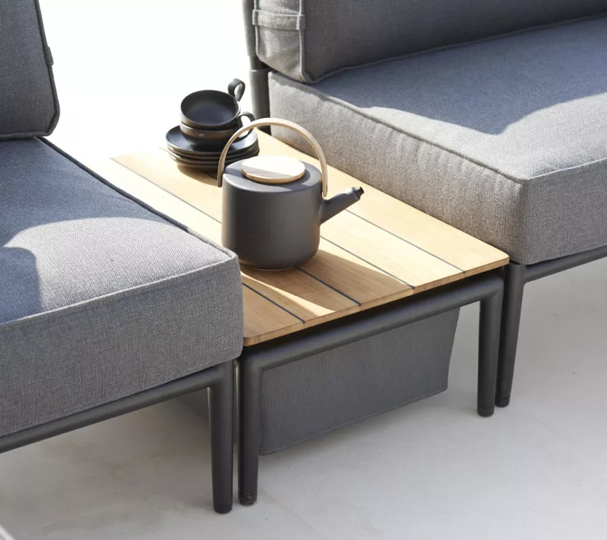 De Conic box salontafel 74×52 van Cane-line is ontworpen door door Foersom & Hiort-Lorenzen MDD. De salontafel is 74 centimeter lang, 52 centimeter breed en 30 centimeter hoog. De koffietafel weegt 11,67 kilogram en heeft een frame gemaakt van aluminium. Het tafelblad is gemaakt van SVLK-gecertificeerd teakhout. De bijzettafel is voorzien van een box onder het tafelblad om spullen in op te bergen. De box is gemaakt van Cane-line Tex (gecoat polyester). Dit materiaal is weerbestendig en heeft een QuickDry functie. De tafel vereist minimaal onderhoud en is weerbestendig. Om de tafel zo mooi mogelijk te houden, adviseren wij de salontafel tijdens de winter binnen te zetten of overdekt te bewaren, bijvoorbeeld onder een overkapping of meubelcover. Om de kleur en de glans van het teak te behouden, raden wij aan teakolie te gebruiken. De Conic box salontafel is verkrijgbaar in verschillende kleuren.