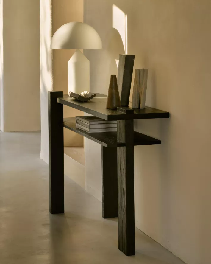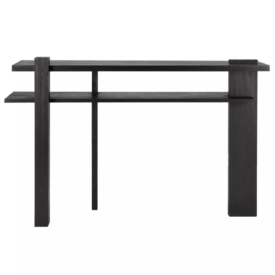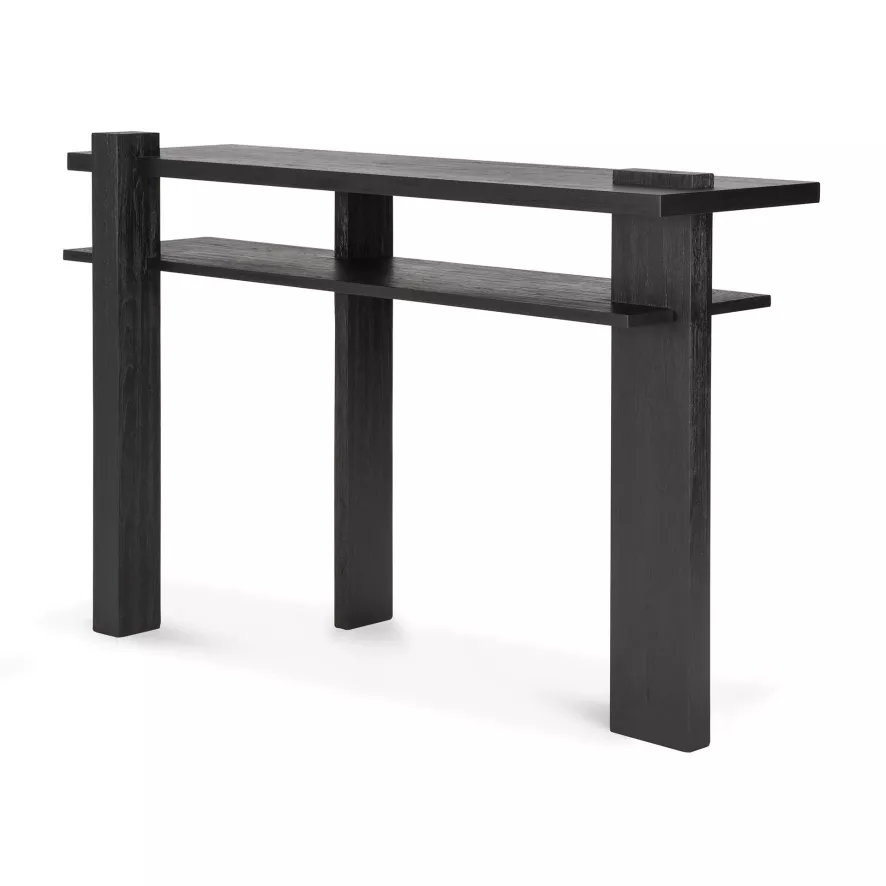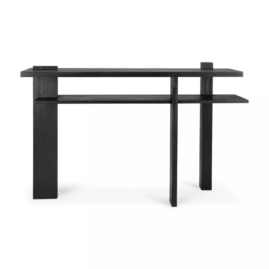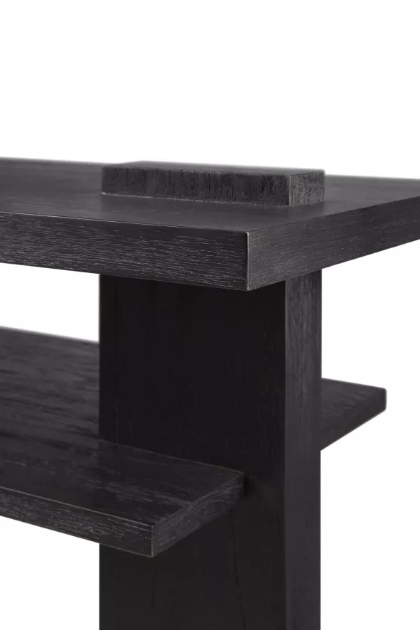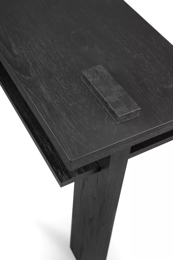 De Abstract sidetable teak zwart van Ethnicraft heeft een lengte van 133 centimeter, een breedte van 41 centimeter, een hoogte van 84 centimeter en een gewicht van 18,1 kilogram. De tafel is gemaakt van zwart gekleurd en geborsteld teakhout en is afgewerkt met een vernislaag. Ethnicraft adviseert een droge doek te gebruiken bij het afstoffen en voor schoonmaken of bij morsen een vochtige doek en natuurlijke zeep.