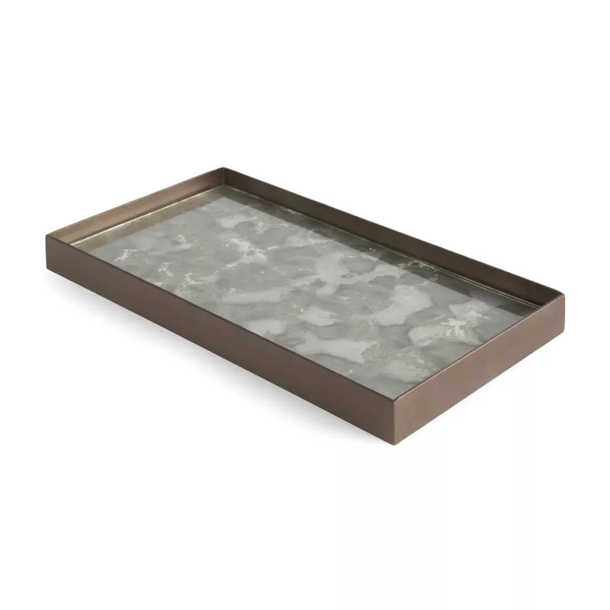 Het Organic dienblad fossil 31×17 van Ethnicraft heeft een lengte van 31 centimeter, een breedte van 17 centimeter en een hoogte van 3 centimeter. Het dienblad heeft een frame van brons gekleurd metaal en een blad van glas dat met de hand geverfd is. Dit dienblad heeft een gewicht van 1,25 kilogram en een maximum draaggewicht van 3,4 kilogram. Het Organic dienblad fossil 31×17 van Ethnicraft is alleen geschikt voor gebruik binnenshuis.