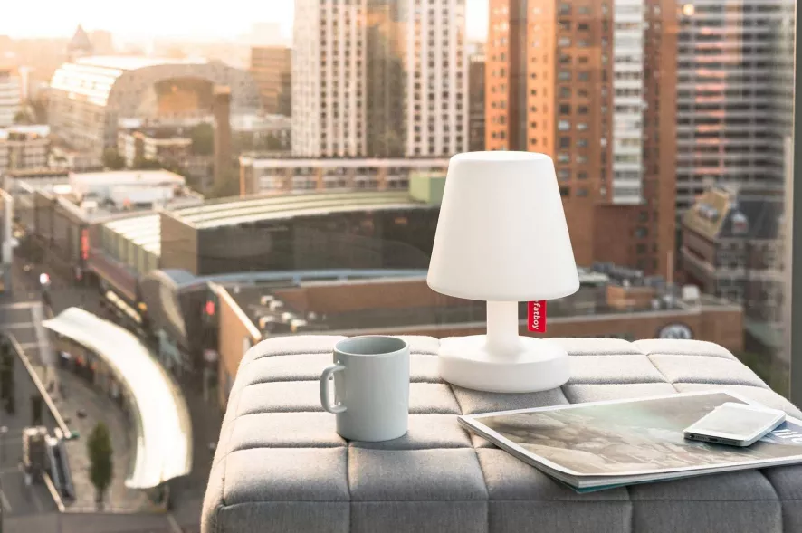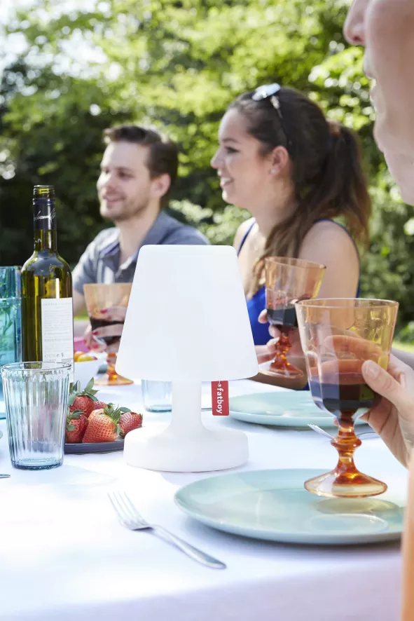 De Fatboy Edison the Petit is 25 centimeter hoog en een diameter van 16 centimeter. De lamp is gemaakt van wit kunststof, dat doorschijnend blijkt wanneer je het licht aandoet. Leuk detail: het kenmerkende rode label is de schakelaar. Zet de lamp aan of uit door kort aan het rode Fatboy label te trekken. Trek aan het label en houd hem vast, hierdoor wordt de dimmer geactiveerd. Als je de lamp uitzet zal hij de laatste lichtsterkte onthouden en gebruiken bij het opnieuw aanzetten van de Edison the Petit. De Edison is oplaadbaar, draagbaar en kan ook buiten staan, eenmaal opgeladen neem je hem overal mee naar toe. De gemiddelde brandtijd van de Fatboy Edison the Petit is 7,5 tot 8 uur, afhankelijk van de lichtstand. De oplaadkabel wordt meegeleverd, maar zonder adapter. Gebruik de adapter van uw telefoon, een Fatboy adapter of sluit de USB-kabel aan op je computer. De lamp kan buiten gebruikt worden, maar bij regen moet je hem wel even naar binnen halen. De lamp heeft een IP21 waarde, dit betekend spatwaterdicht. Reinig de tafellamp voorzichtig met een zachte doek en lauw water (indien nodig met neutrale zeep). Gebruik geen reinigingsmaterialen die chemicaliën bevatten.