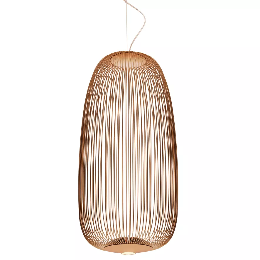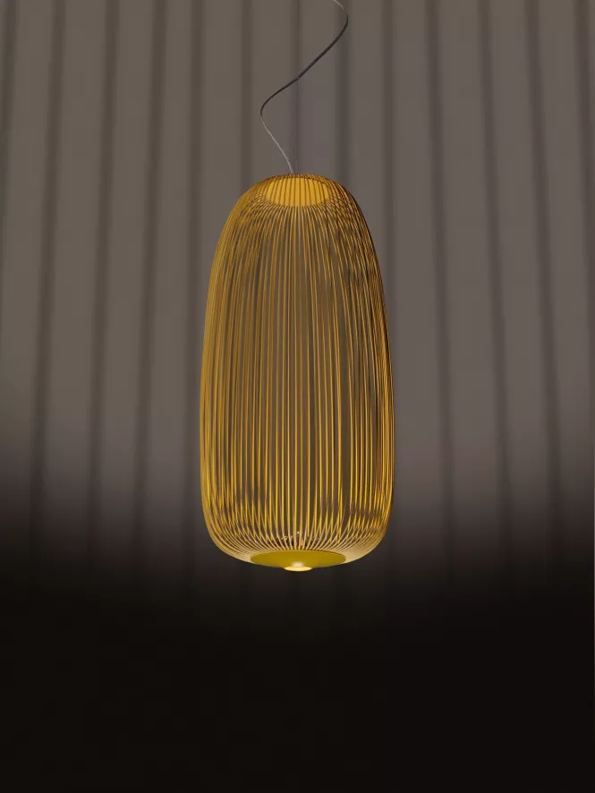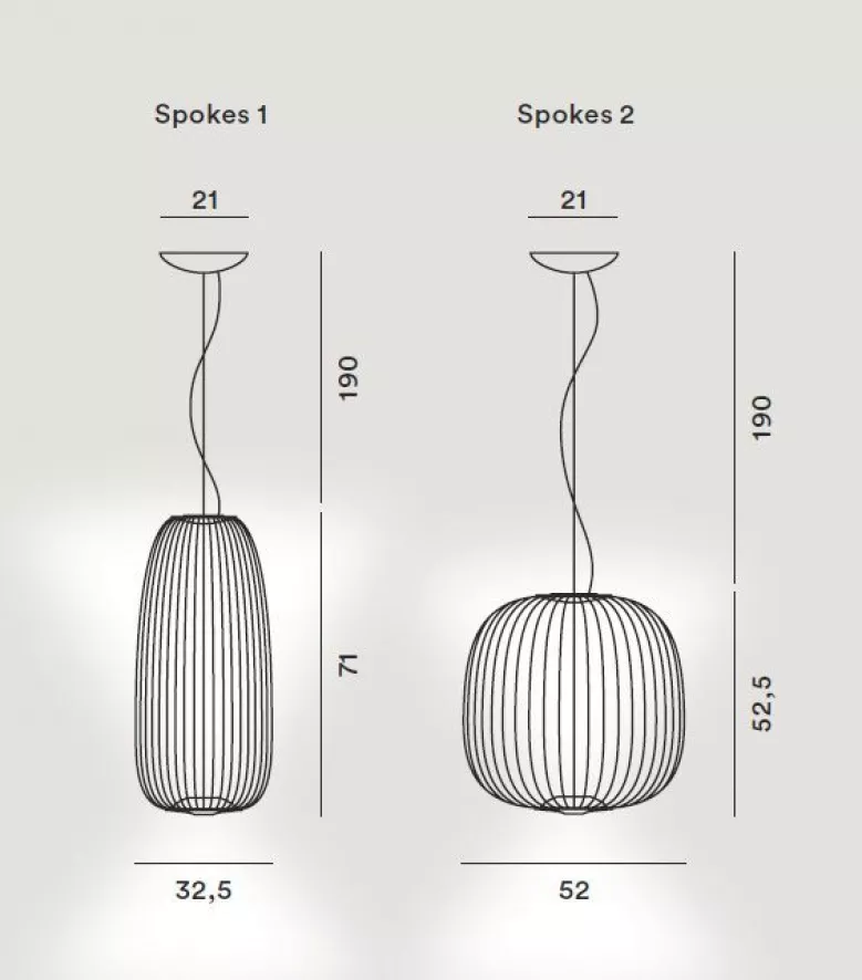 De Spokes 1 hanglamp LED van Foscarini is er in het geelgoud of wit. Hij heeft een diameter van 32,5 centimeter en een hoogte van 71 centimeter. De kabel is 190 centimeter en de baldakijn, waar de lamp aan hangt, heeft een diameter van 21 centimeter. Er zit een LED-lamp in van 38,5 Watt, 2700 Kelvin en 2780 Lumen. Hij is gemaakt van vernist staal en aluminium en weegt 4,4 kilo.