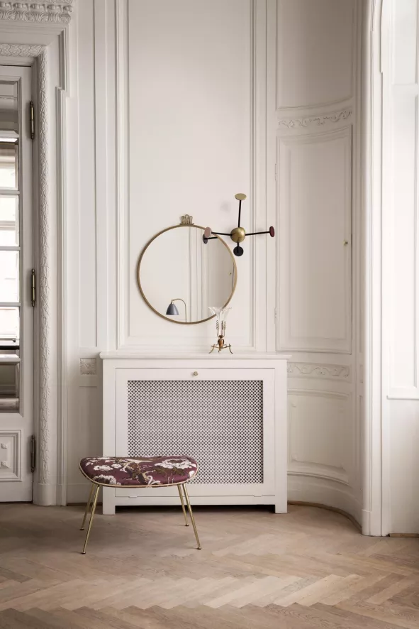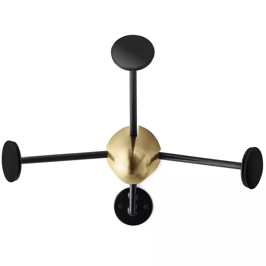 De kapstok is gemaakt van metaal en messing. Je hangt de kapstok op aan de muur. Hij is 38 centimeter lang, 20 centimeter breed en 34 centimeter hoog. Er zitten drie haakjes aan.