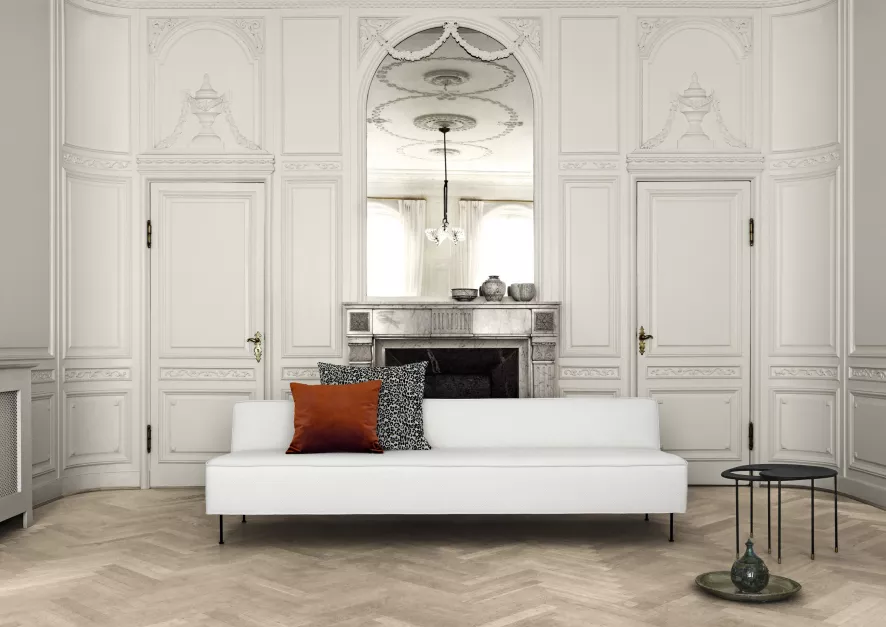 De Modern Line bank 300cm van Gubi is 300 centimeter breed, 84 centimeter diep en 69 centimeter hoog. De bank heeft een zithoogte van 41 centimeter. Het onderstel is van staal. De bank is leverbaar in verschillende stofsoorten: