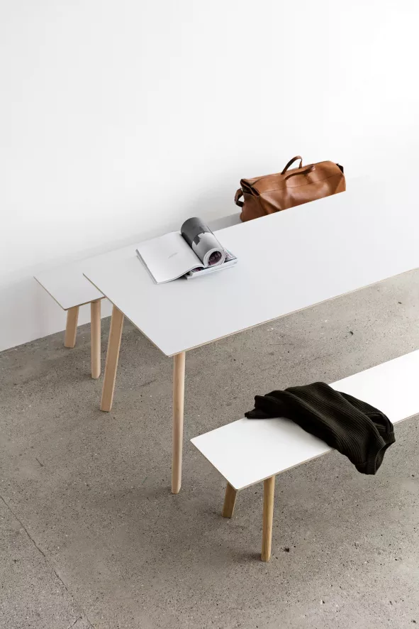 De CPH Deux 215 eetbank 200 met onbewerkt beuken onderstel van Hay heeft een lengte van 200 centimeter, een breedte van 35 centimeter en een hoogte van 45 centimeter. De bank heeft een zitting gemaakt van plywood en laminaat. Deze variant heeft een onderstel gemaakt van onbewerkt beuken. Je kunt voor het laminaat kiezen uit verschillende kleuren. De eetbank is ook verkrijgbaar met andere onderstellen en in andere afmetingen.