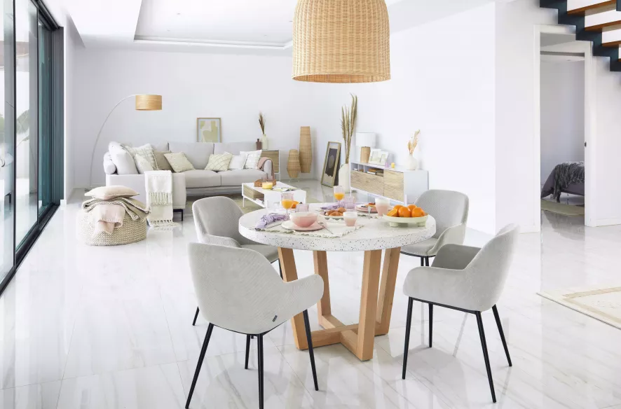 De Kamaria vloerlamp medium van Kave Home heeft een diameter van 30 centimeter en een hoogte van 70 centimeter. De vloerlamp heeft een metalen voet en een lampenkap van rotan dat met de hand geweven is. De vloerlamp is voorzien van een kunststof kabel van 160 centimeter lang.