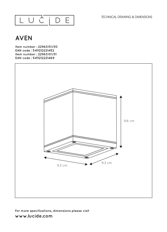 De Aven opbouwspot vierkant IP65 van Lucide heeft een breedte en diepte van 9,3 centimeter en een hoogte van 9,6 centimeter. De opbouwspot is gemaakt van hoogwaardig aluminium en is afgewerkt met een poedercoat. Hiervoor heb je de keuze uit een witte of zwarte afwerking. De benodigde lichtbron voor deze opbouwspot wordt niet meegeleverd. Voor deze opbouwspot heb je een lichtbron met een GU10 fitting van maximaal 50 Watt nodig. Het lampje is kantelbaar en kan aangesloten worden op een dimmer. Met een IP-waarde van 65 is deze opbouwspot beschermd tegen waterstralen en is daarmee geschikt voor gebruik in de badkamer. De Aven opbouwspot vierkant IP65 van Lucide heeft een gewicht van 0,4 kilogram en is in verschillende uitvoeringen verkrijgbaar.