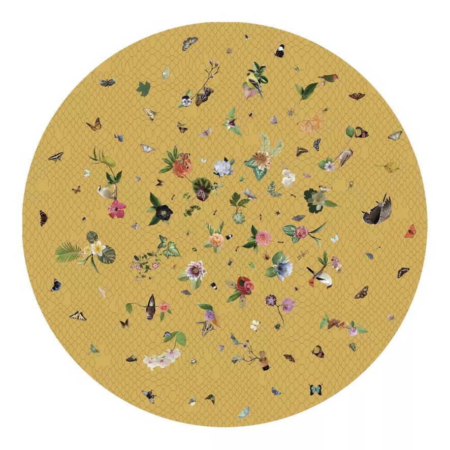 Het Garden of Eden Round Netting vloerkleed van Moooi Carpets is verkrijgbaar in twee kleuren, in het grijs of in het geel. Het heeft een diameter van 250 centimeter. Dit is een getuft tapijt van 100% polyamide en het valt in de gebruiksklasse CL33, wat betekent dat het geschikt is voor zwaar contact en geluid goed absorbeert. De kleur is er digitaal op geprint met een chromojet en het tapijt heeft een achterkant van vilt.