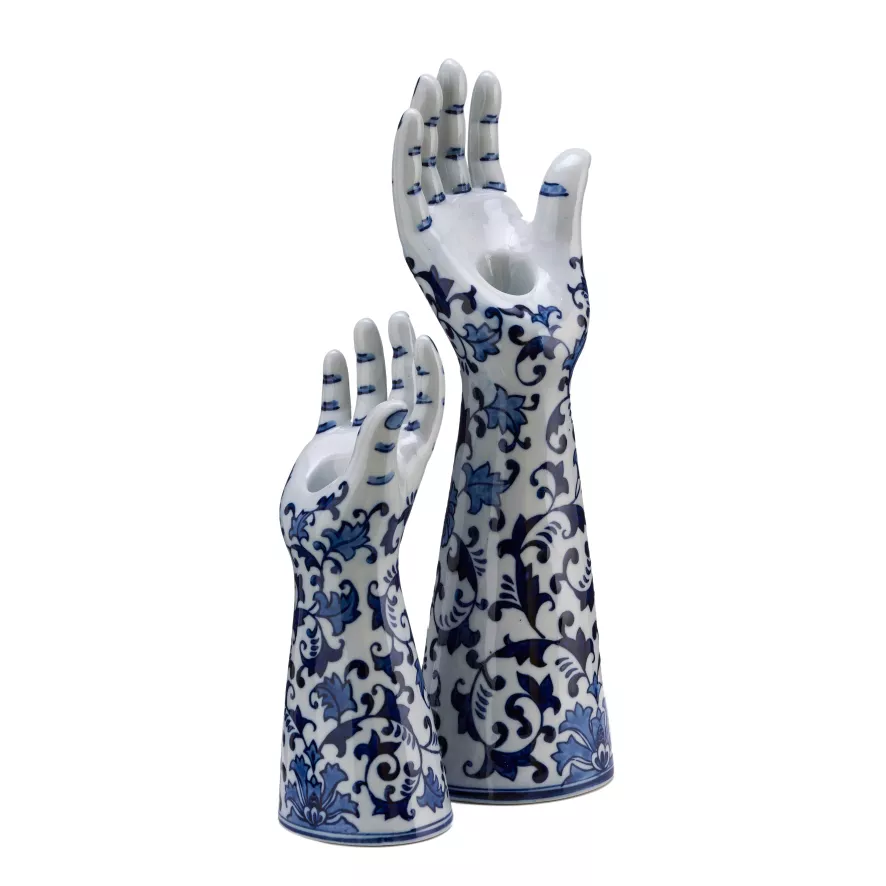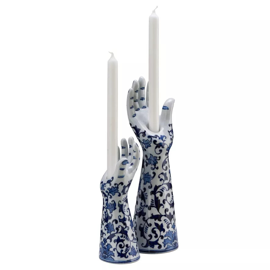 De Pols Potten Handsup! kandelaar is verkrijgbaar in twee maten; S en L. Formaat S is 8,5 centimeter breed; 9,5 centimeter diep en 25,5 centimeter hoog. Deze kandelaar weegt 0,65 kilogram. Formaat L is 10 centimeter breed; 10,5 centimeter diep en 38,5 centimeter hoog. Deze kandelaar (L) weegt 1,3 kilogram. De kaarsenstandaard is gemaakt van porselein. Daarnaast is de Pols Potten Handsup! kandelaar handbeschilderd en heeft Delftsblauwe decoratie.