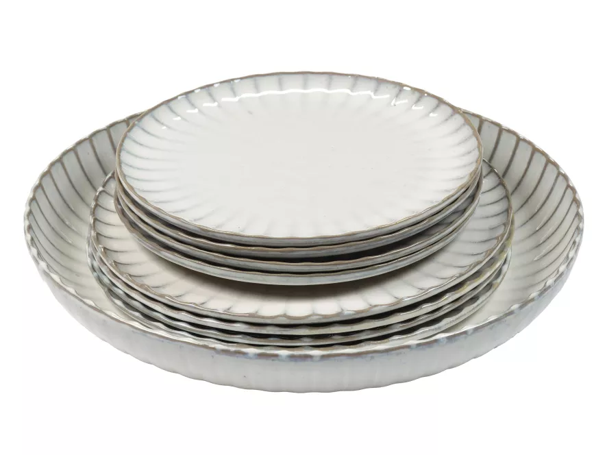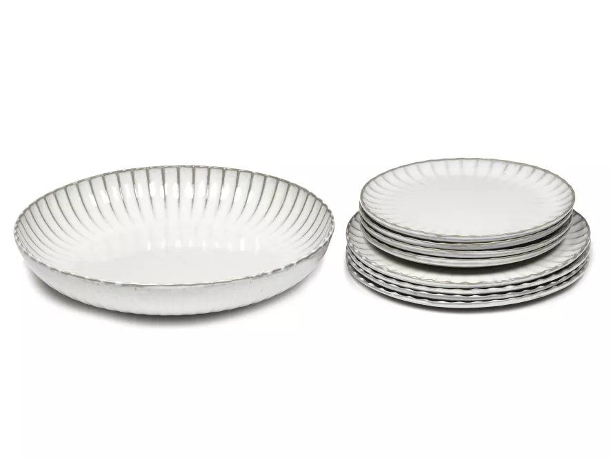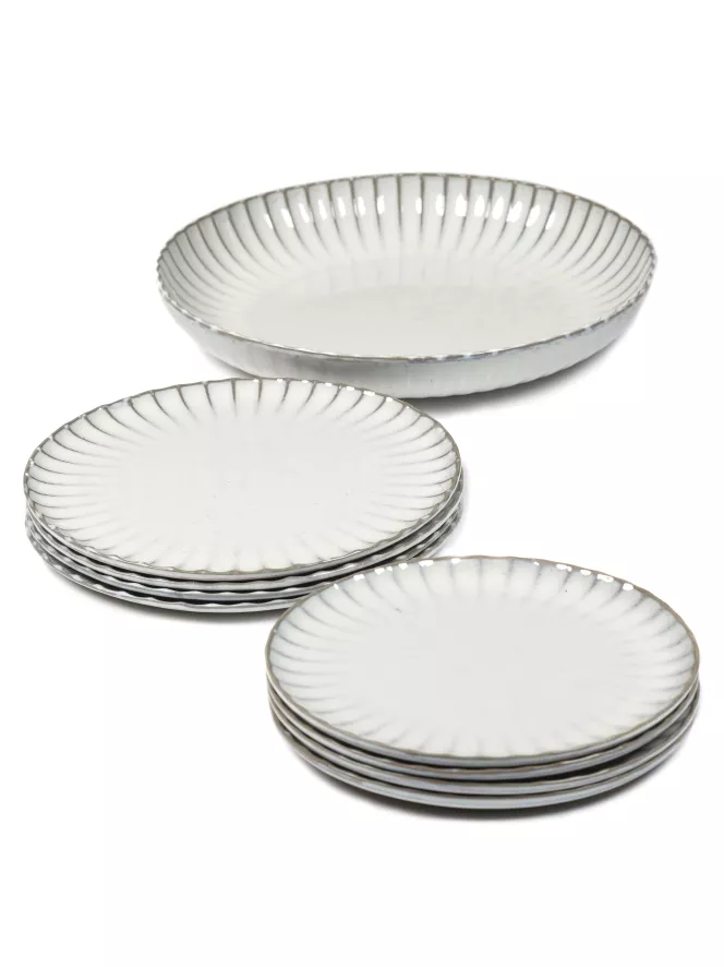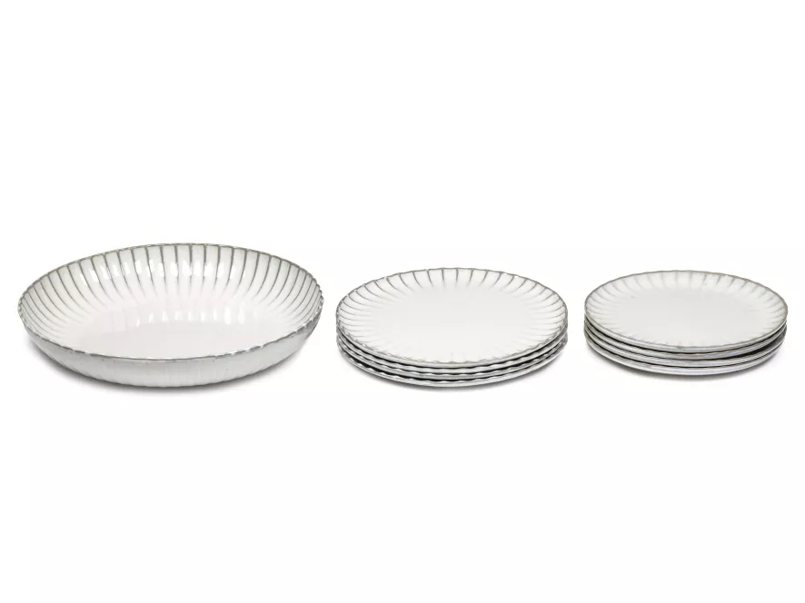 De Apero Inku borden set van Serax is ontworpen door Sergio Herman. De set bestaat uit 1 schaal met diameter van 32 centimeter en een hoogte van 5 centimeter, 4 borden met een diameter van 24 centimeter en een hoogte van 1,7 centimeter en 4 borden met een diameter van 21 centimeter en een hoogte van 1,7 centimeter. De 9-delige set borden zijn gemaakt van keramiek en hebben een witte kleur.