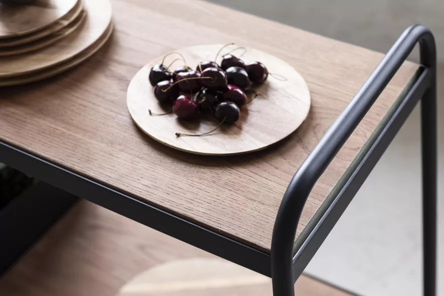 De James trolley ontworpen door Marie Michielssen, van Serax heeft een lengte van 70 centimeter, een breedte van 38 centimeter en een hoogte van 80 centimeter. De trolley heeft een metalen frame, afgewerkt met een zwarte coating, en houten planken. De James hoog weegt 14 kilogram.