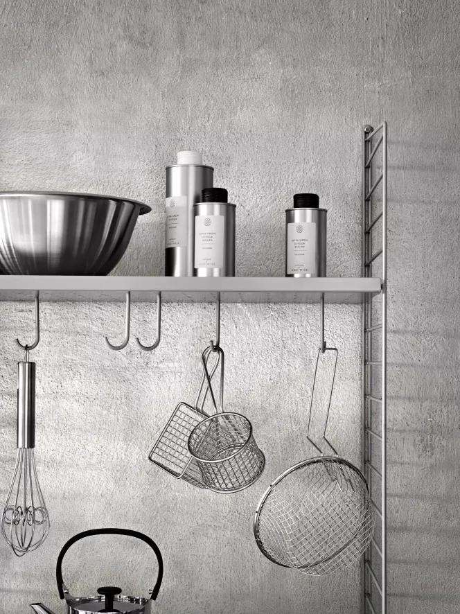 De Hook set van 5 van String wordt gemaakt van gelakt metaal en is verkrijgbaar in drie kleuren: wit, grijs of zwart. Eén haakje heeft een hoogte van 8,5 centimeter.