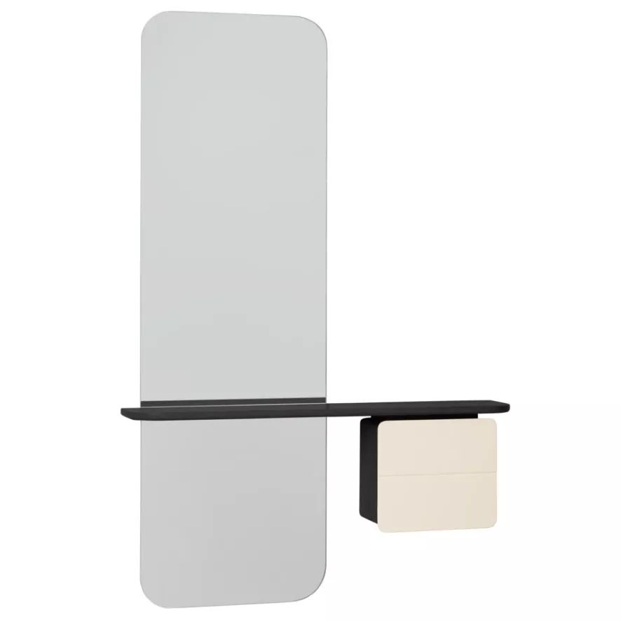 De One more Look spiegel van Umage bestaat uit een spiegel, een plank en een kastje met twee vakken. De spiegel heeft een hoogte van 118 centimeter en een breedte van 38 centimeter. De donker eiken plank heeft een breedte van 78 centimeter en een diepte van 15 centimeter. Het kastje heeft een breedte van 25 centimeter en een hoogte van 17,6 centimeter. De spiegel wordt in twee dozen geleverd. De voorzijde van het kastje is verkrijgbaar in verschillende kleuren. De One More Look spiegel is ook beschikbaar met een naturel eiken of donker eiken plank en kastje.