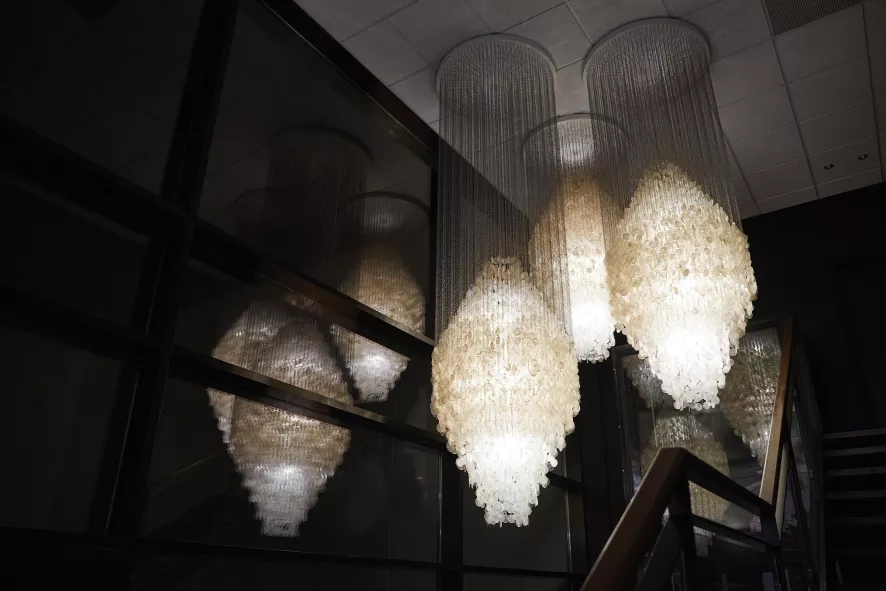De lamp heeft een diameter van 100 centimeter en een hoogte van 200 centimeter. De lamp is gemaakt van een roestvrijstalen ring met daaraan parelmoerkleurige schijfjes van schelpen. Het plafondkapje is gemaakt van wit gelakt MDF en het snoer is gemaakt van transparant plastic. De hanglamp is voorzien van een E27 fitting geschikt voor een lichtbron met een maximale Wattage van 60.