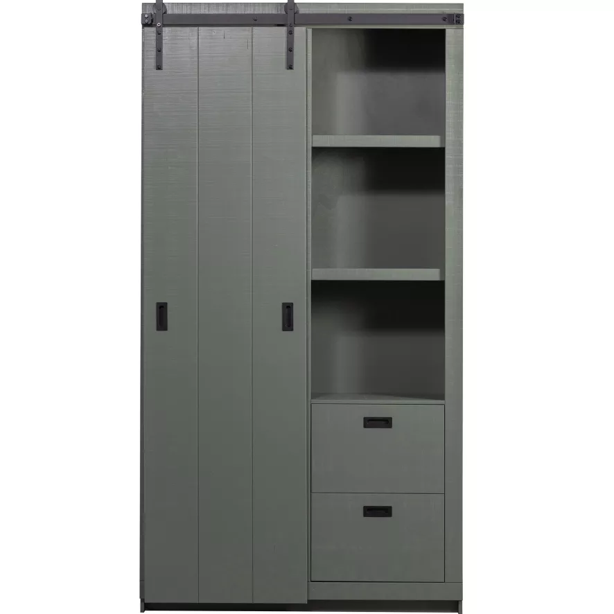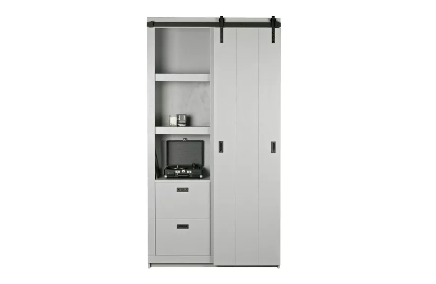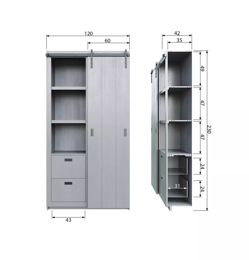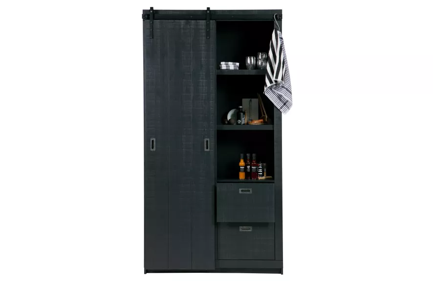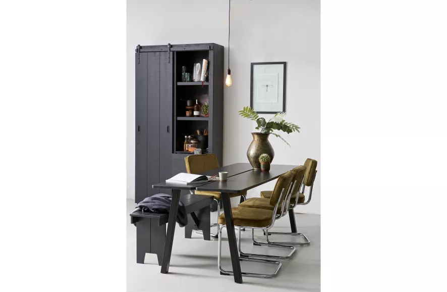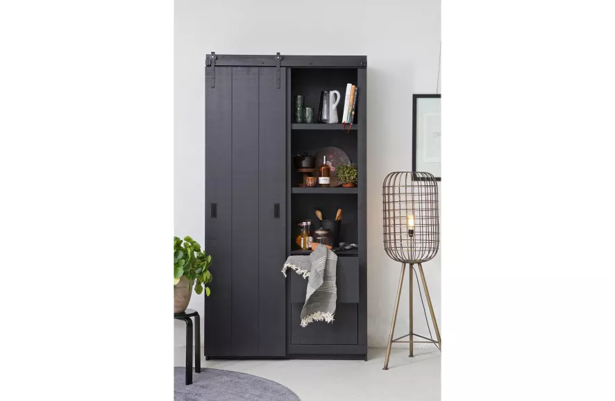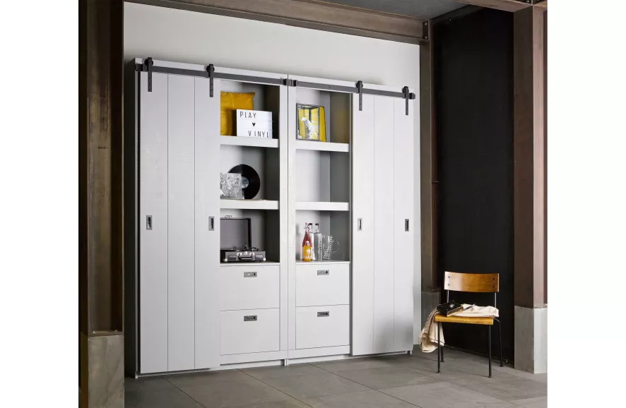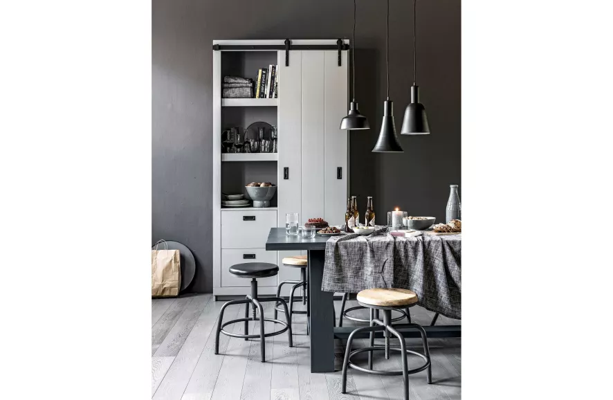 De Barn buffetkast van vtwonen is 122 centimeter breed, 37 centimeter diep en 230 centimeter hoog. De kast is gemaakt van grof bezaagd FSC-gecertificeerd grenenhout. De kast heeft vier lades en twee open stukken met in totaal 6 planken. De bank is verkrijgbaar in verschillende kleuren. De kast moet thuis in elkaar worden gezegd en wordt geleverd inclusief duidelijke montage-instructie.