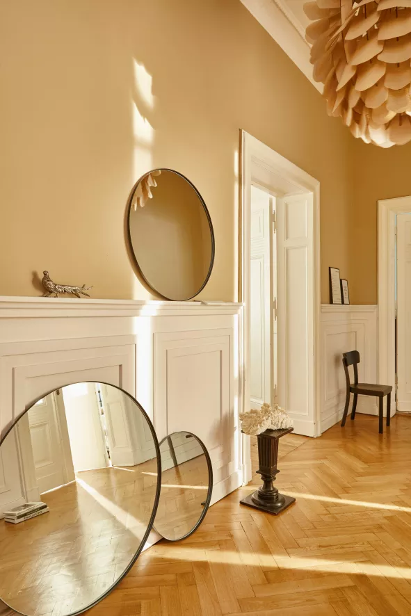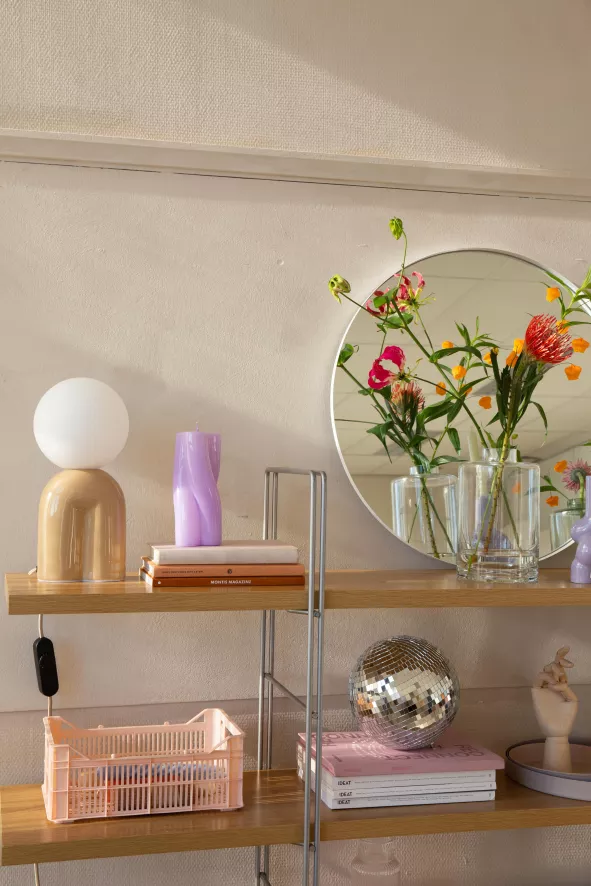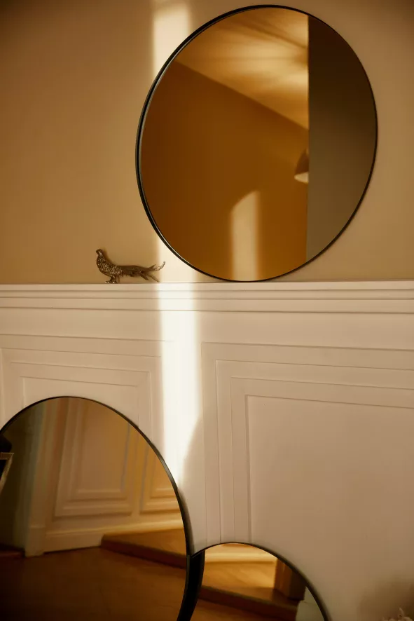 Deze spiegel heeft een lijst van gepoedercoat staal en bestaat verder uit glas. De spiegel is beschikbaar in verschillende maten. Deze variant heeft een diameter van 60 centimeter, en bij de andere twee varianten heb je de keuze uit een diameter van 80 centimeter of 100 centimeter. De spiegel heeft een diepte van 2.3 centimeter en weegt 5.14 kilogram. De spiegel maakt gebruik van een railsysteem waardoor het makkelijk is hem aan de muur te bevestigen.